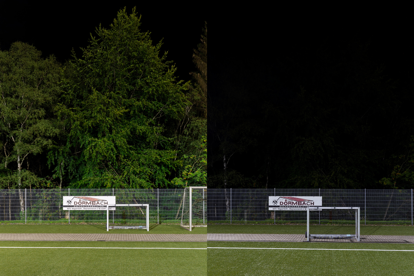 Links: nicht entblendete klassische Anlage; rechts: entblendete LED-Anlage