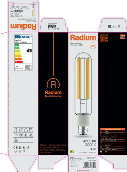 Les données techniques de construction correspondent à DIN et IEC. Le fabricant décline toute responsabilité pour des dommages corporels et matériels dus à une utilisation incorrecte. Les valeurs d’exploitation et les dimensions sont aux tolérances habituelles. A l’exception des modèles portant une identification spéciale, les lampes à incandescence sont destinées aux réseaux d’alimentation électrique de 230V. Les modèles non cités – également avec culots et tensions différents – sur demande. La vente et la livraison se font aux conditions de livraison et de paiement de Radium en vigueur à la conclusion du contrat. Les unités à envoyer sont économiques pour l’achat et la logistique, dans la mesure du possible veuillez commander des quantités qui répondent à cette attente. Nous facturons un supplément de 10 % pour les commandes de très petites quantités (fractions), qui par type de lampe, sont en dessous de chaque unité d’envoi. Tous changements concernant l’emballage ou le produit sont interdits car ils portent atteinte aux droits de la marque Radium. De plus, les qualités techniques du produit pourraient changer à son désavantage voire mener à sa destruction. Pour ces dommages, Radium décline toute responsabilité.