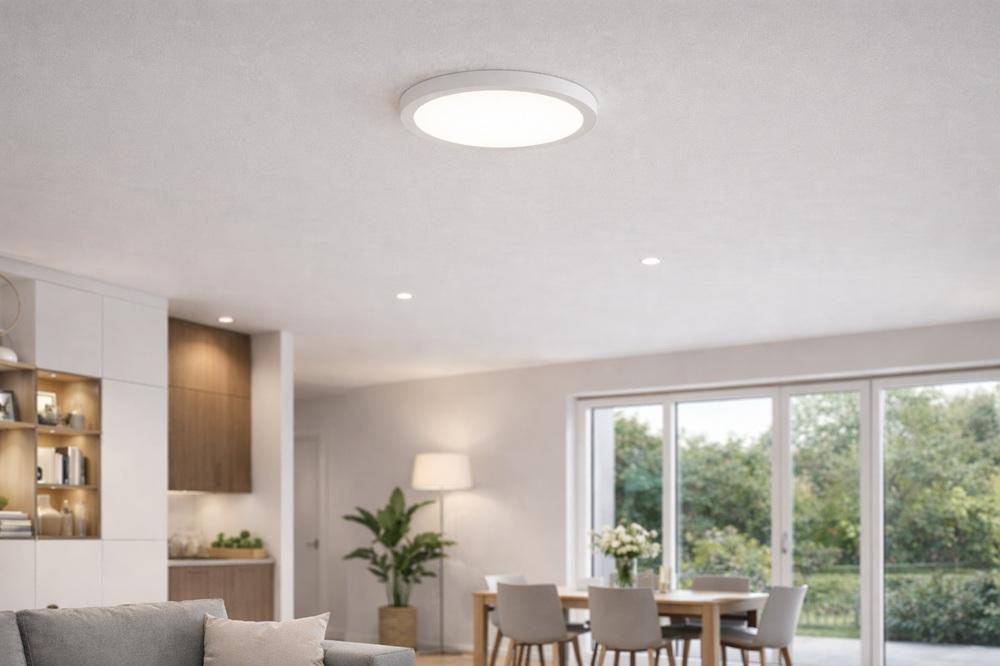 Flaches LED-Downlight IP54 für An-/Einbau und verschiedene Deckenausschnitte, Power Select, Lichtfarbe einstellbar, gleichmäßiger Lichtaustritt.