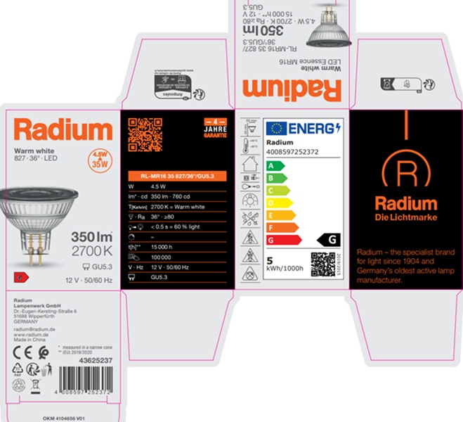 Die technischen Konstruktionsdaten entsprechen DIN und IEC. Der Hersteller übernimmt bei unsachgemäßer Verwendung oder Behandlung keine Haftung für Personen- oder Sachschäden. Betriebswerte und Abmessungen gelten mit den üblichen Toleranzen. Verwandte Typen (andere Sockel, Spannungen) evtl. auf Anfrage. Verkauf und Lieferung gemäß den am Tage des Vertragsabschlusses gültigen Radium Lieferungs- und Zahlungsbedingungen. Versandeinheiten sind wirtschaftlich für Einkauf und Logistik, bitte berücksichtigen Sie das bei der Bestellmenge. Bei Kleinstmengen (Anbruch), die die Versandeinheiten unterschreiten, berechnen wir pro Lampentyp einen Aufschlag von 10%. Veränderungen jedweder Art an Verpackung oder Produkt sind unzulässig, da dadurch Radium Markenrechte verletzt werden. Außerdem können sich die technischen Eigenschaften des Produktes zu dessen Nachteil verändern oder gar zu Zerstörung führen. Für Folgeschäden kann Radium in keinem Fall haften.