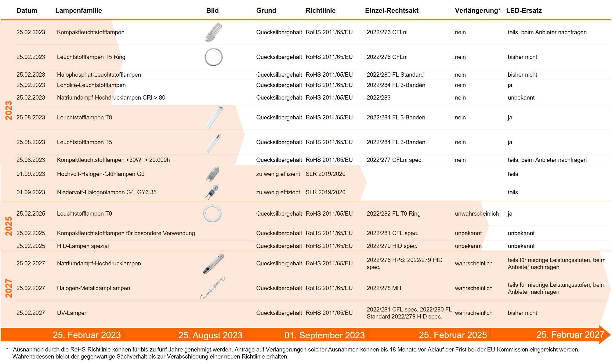 Die Ausnahmeregelungen für Hochdruckentladungslampen sind in den Änderungsrichtlinien (EU) 2022/275 bis 2022/284 zur RoHS-Richtlinie 2011/65/EU zu finden. Beispielhaft hier ein Auszug aus der Richtlinie (EU) 2022/278) für Halogenmetalldampflampen:
