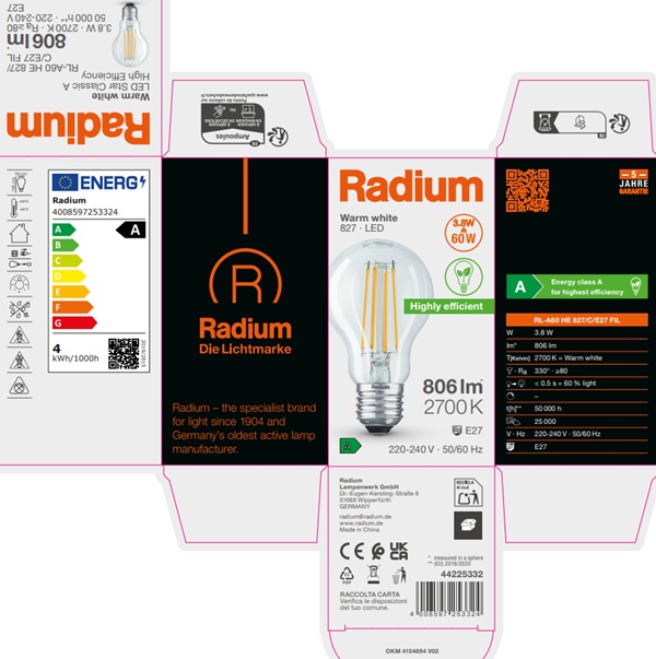 The technical design data in accordance with DIN and IEC. The producer does not take any responsibility for damage to persons or property in case of unsuitable operation or handling of the product. Operating data and dimensions are valid within the usual tolerances. Related lamp types (different bases, mains voltages) may be available on request. Sale and delivery are effected in accordance with the Radium Terms of Delivery and Payment valid on the day of conclusion of contract. Packing units offer economical advantages to the purchase and logistic department. Please match your quantity volume accordingly. For orders of a minimum quantity (clefts) with a lamp model the amount lower than the volume of each packaging unit, we will invoice 10 % additional charge per lamp type. Technical changes and terms of delivery are reserved. Manipulation of any kind to packaging or product is not permissible as this will violate Radium brand rights. Furthermore, technical properties of the product can change to its disadvantage or even destruction. Therefore, Radium cannot be responsible for consequential damages.