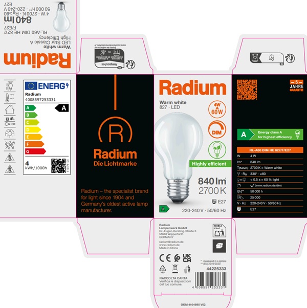 The technical design data in accordance with DIN and IEC. The producer does not take any responsibility for damage to persons or property in case of unsuitable operation or handling of the product. Operating data and dimensions are valid within the usual tolerances. Related lamp types (different bases, mains voltages) may be available on request. Sale and delivery are effected in accordance with the Radium Terms of Delivery and Payment valid on the day of conclusion of contract. Packing units offer economical advantages to the purchase and logistic department. Please match your quantity volume accordingly. For orders of a minimum quantity (clefts) with a lamp model the amount lower than the volume of each packaging unit, we will invoice 10 % additional charge per lamp type. Technical changes and terms of delivery are reserved. Manipulation of any kind to packaging or product is not permissible as this will violate Radium brand rights. Furthermore, technical properties of the product can change to its disadvantage or even destruction. Therefore, Radium cannot be responsible for consequential damages.