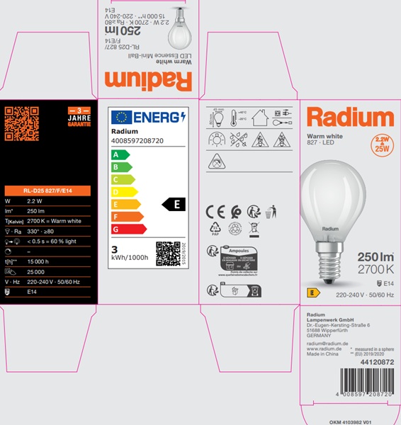 Energielabel - LED Essence Mini-Ball, frosted, RL-D25 827/F/E14