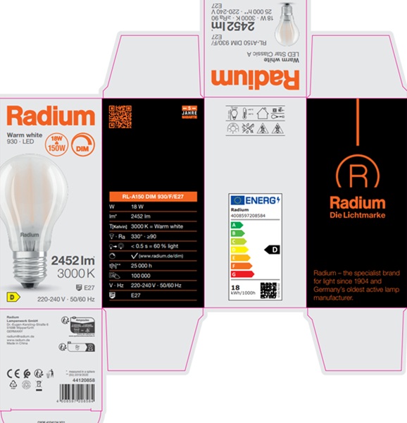 The technical design data in accordance with DIN and IEC. The producer does not take any responsibility for damage to persons or property in case of unsuitable operation or handling of the product. Operating data and dimensions are valid within the usual tolerances. Related lamp types (different bases, mains voltages) may be available on request. Sale and delivery are effected in accordance with the Radium Terms of Delivery and Payment valid on the day of conclusion of contract. Packing units offer economical advantages to the purchase and logistic department. Please match your quantity volume accordingly. For orders of a minimum quantity (clefts) with a lamp model the amount lower than the volume of each packaging unit, we will invoice 10 % additional charge per lamp type. Technical changes and terms of delivery are reserved. Manipulation of any kind to packaging or product is not permissible as this will violate Radium brand rights. Furthermore, technical properties of the product can change to its disadvantage or even destruction. Therefore, Radium cannot be responsible for consequential damages.