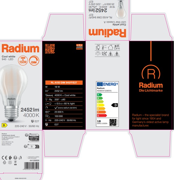 The technical design data in accordance with DIN and IEC. The producer does not take any responsibility for damage to persons or property in case of unsuitable operation or handling of the product. Operating data and dimensions are valid within the usual tolerances. Related lamp types (different bases, mains voltages) may be available on request. Sale and delivery are effected in accordance with the Radium Terms of Delivery and Payment valid on the day of conclusion of contract. Packing units offer economical advantages to the purchase and logistic department. Please match your quantity volume accordingly. For orders of a minimum quantity (clefts) with a lamp model the amount lower than the volume of each packaging unit, we will invoice 10 % additional charge per lamp type. Technical changes and terms of delivery are reserved. Manipulation of any kind to packaging or product is not permissible as this will violate Radium brand rights. Furthermore, technical properties of the product can change to its disadvantage or even destruction. Therefore, Radium cannot be responsible for consequential damages.