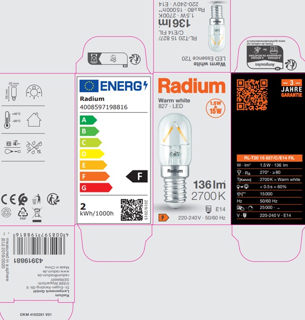 The technical design data in accordance with DIN and IEC. The producer does not take any responsibility for damage to persons or property in case of unsuitable operation or handling of the product. Operating data and dimensions are valid within the usual tolerances. Related lamp types (different bases, mains voltages) may be available on request. Sale and delivery are effected in accordance with the Radium Terms of Delivery and Payment valid on the day of conclusion of contract. Packing units offer economical advantages to the purchase and logistic department. Please match your quantity volume accordingly. For orders of a minimum quantity (clefts) with a lamp model the amount lower than the volume of each packaging unit, we will invoice 10 % additional charge per lamp type. Technical changes and terms of delivery are reserved. Manipulation of any kind to packaging or product is not permissible as this will violate Radium brand rights. Furthermore, technical properties of the product can change to its disadvantage or even destruction. Therefore, Radium cannot be responsible for consequential damages.